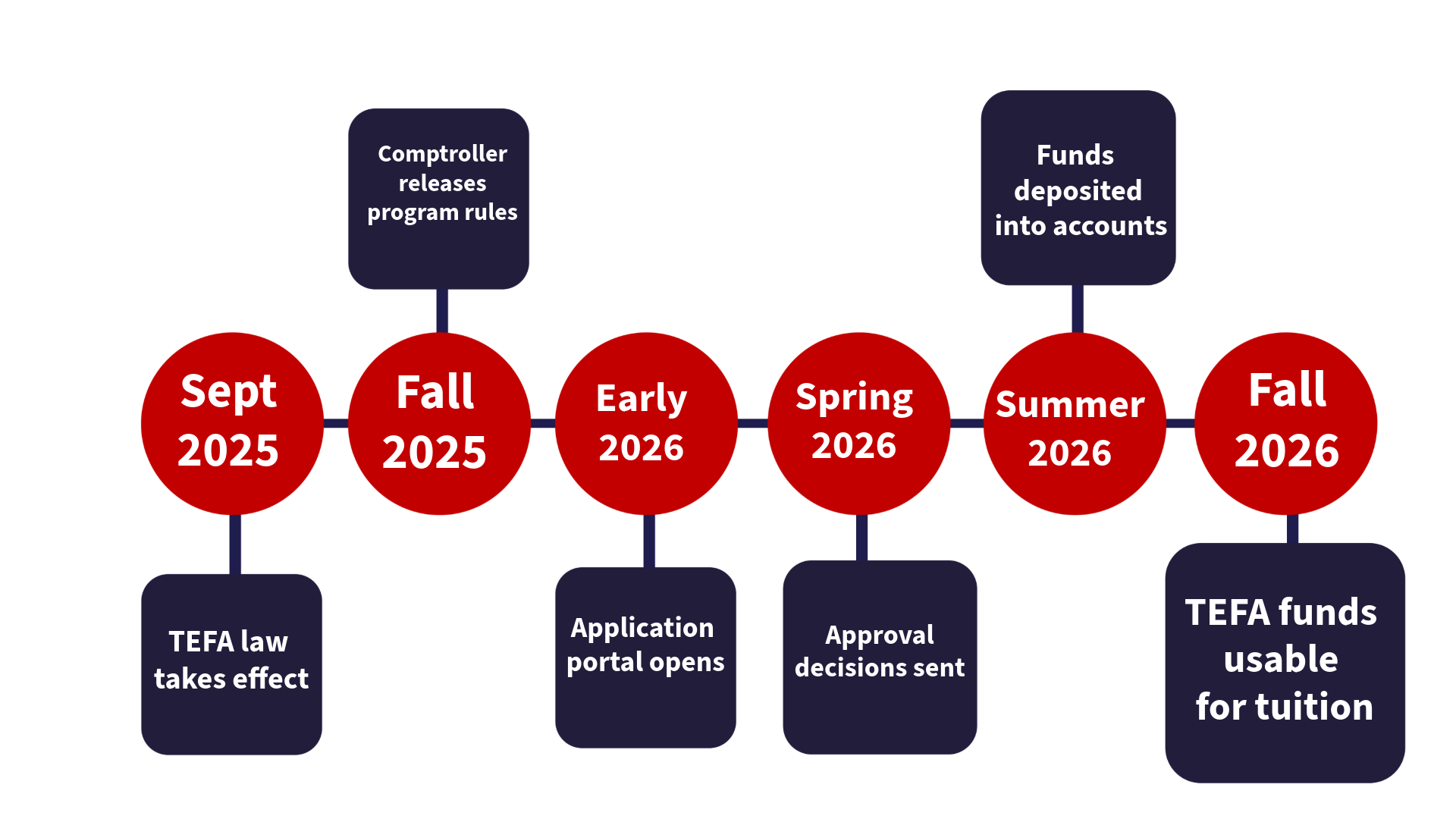 TEFA implementation is being phased in statewide. The key dates below reflect the current understanding of the law and public guidance; always confirm details on the Texas Comptroller’s official TEFA/ESA page.